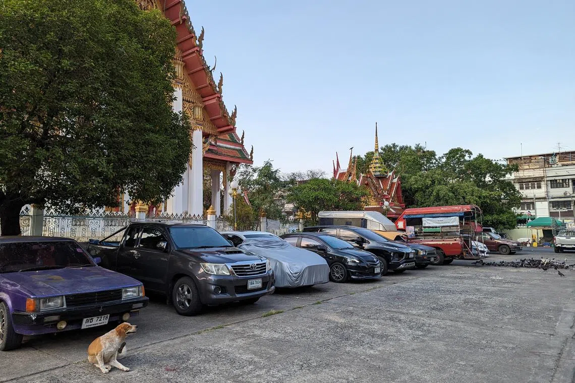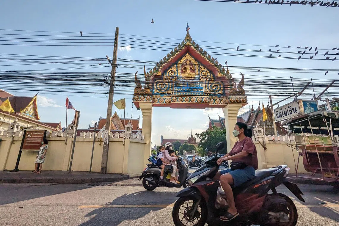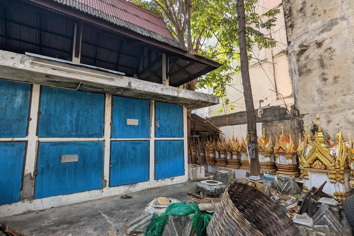 The Wat Phai Ngern is located in a busy Bangkok neighbourhood next to a school and shops.