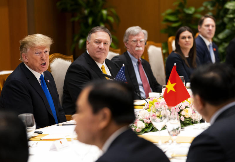 (From left) US President Donald Trump, accompanied by Secretary of State Mike Pompeo; US national security adviser John Bolton and the White House press secretary Sarah Huckabee Sanders, as he meets Prime Minister Nguyen Xuan Phuc of Vietnam in Hanoi on Feb 27, 2019.