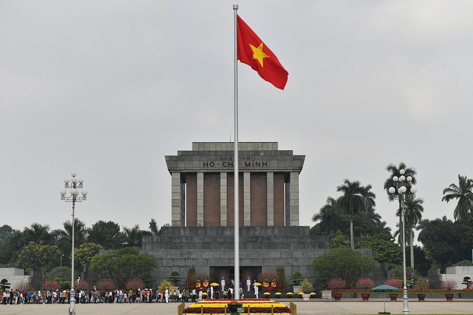A Vietnamese national flag flutters in the wind at the Ho Chih Minh mausoleum in Hanoi, Vietnam on Feb 9, 2019.
