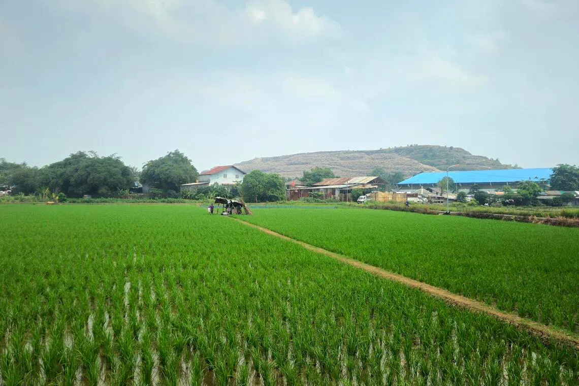 Bantar Gebang landfill looming behind a 7,000 sq m paddy field.