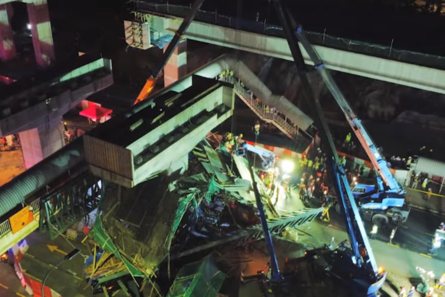 The accident occurred at around 6pm on Wednesday when a trailer lorry carrying an excavator was believed to have hit the scaffolding of the pedestrian bridge near a major highway, the Middle Ring Road 2, in Desa Tun Razak.