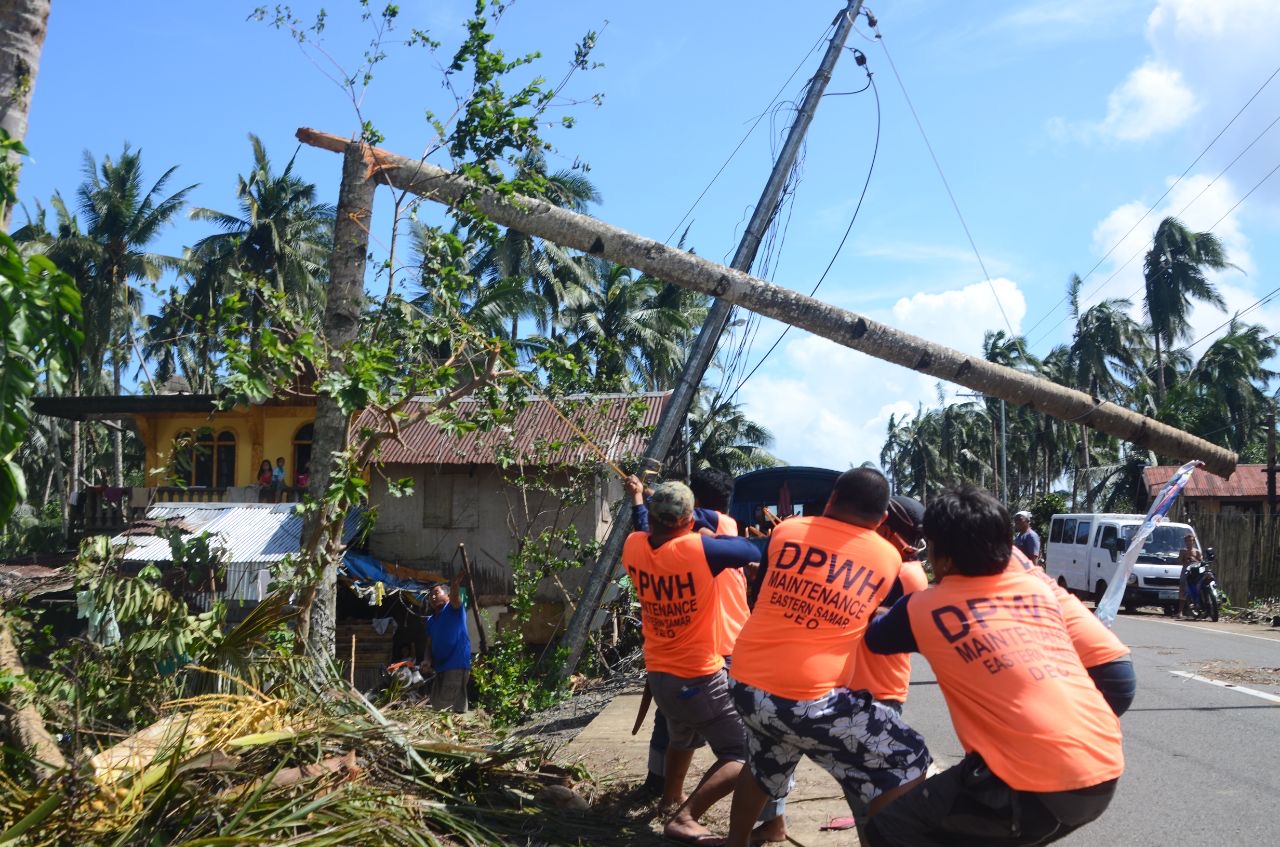 Workers pulling a fallen electric pylon damaged by Typhoon Phanfone in Salcedo town in The Philippines, on Dec 26, 2019.