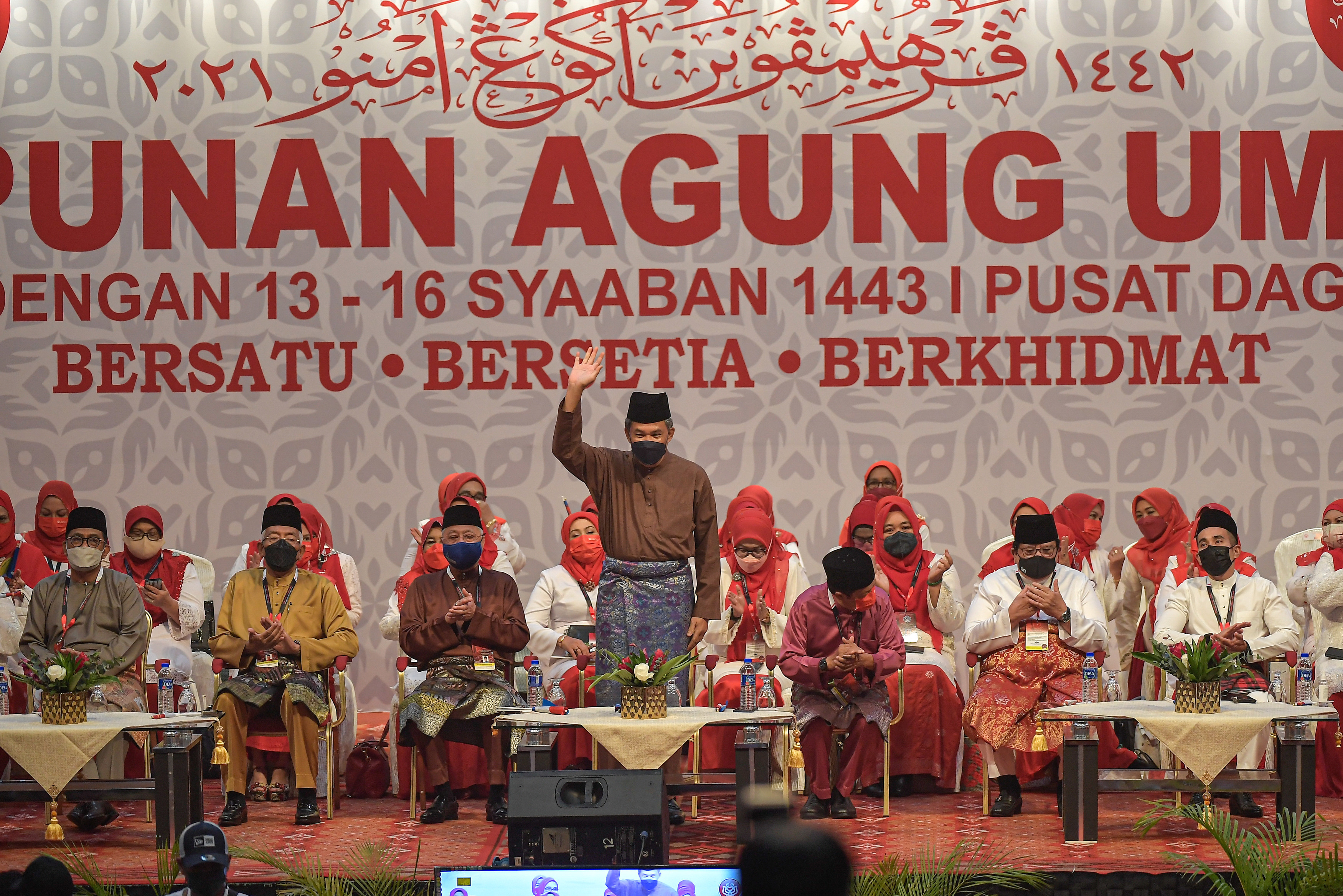 Umno deputy president Mohamad Hasan waving to delegates at the party’s general assembly, on March 16, 2022.