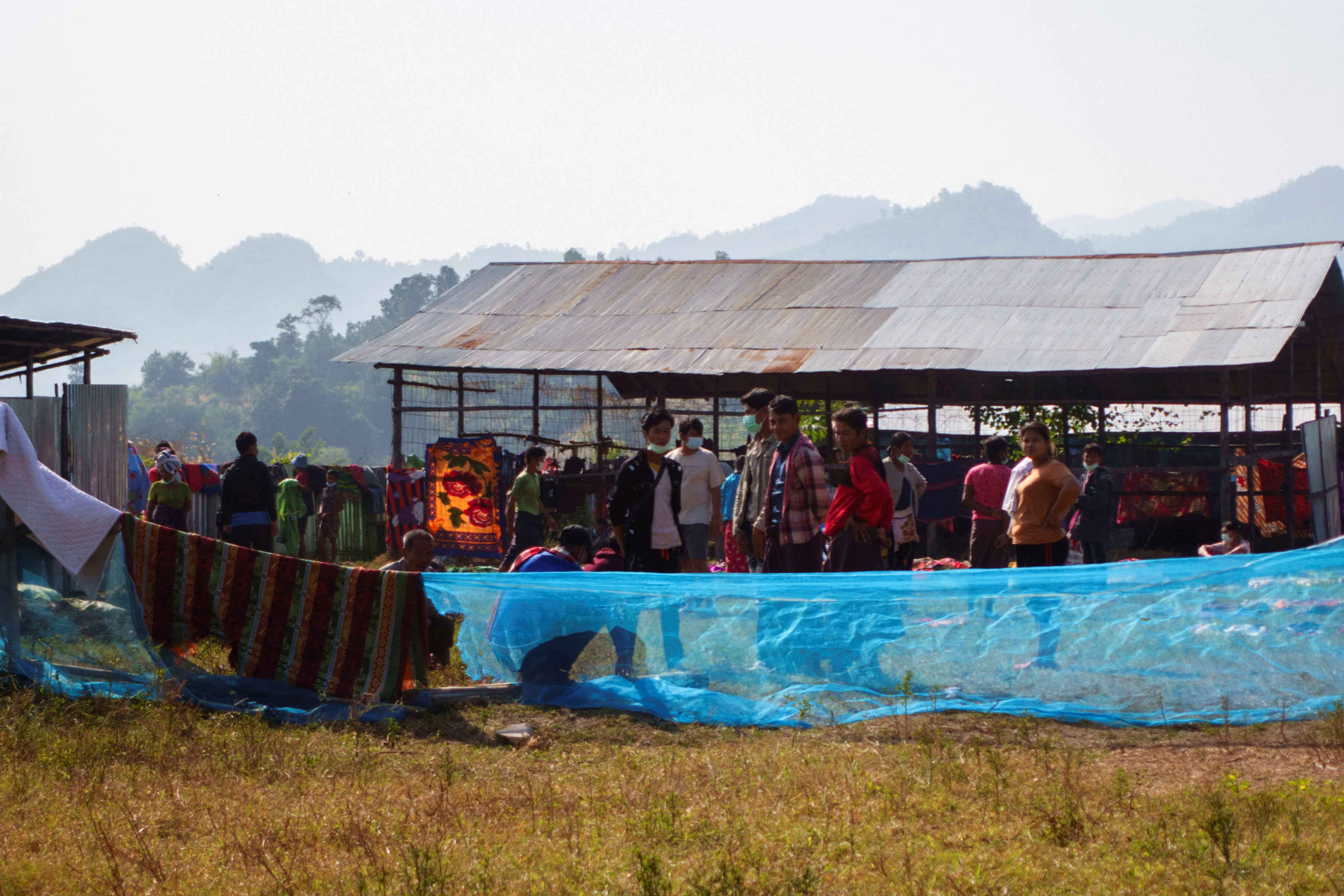 Refugees from Myanmar stand at a temporary shelter in Tak province, Thailand, on Dec 20, 2021.