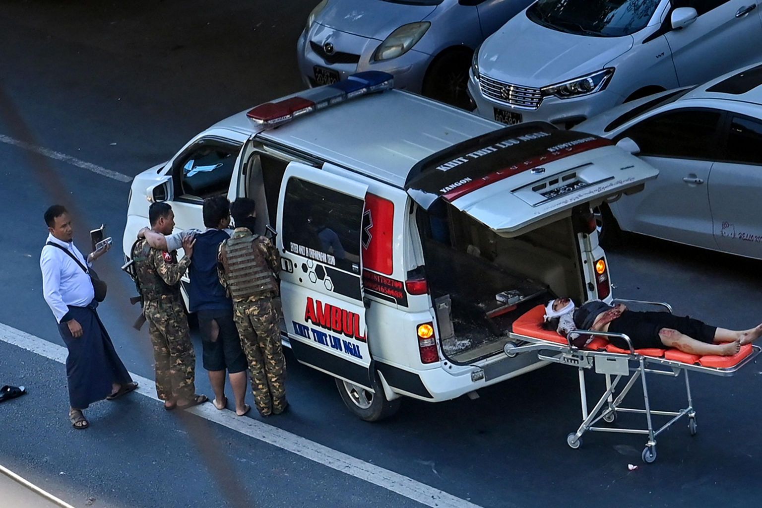 A journalist (third from left) receives medical attention as an injured protester lies on a stretcher in Yangon on Dec 5, 2021.