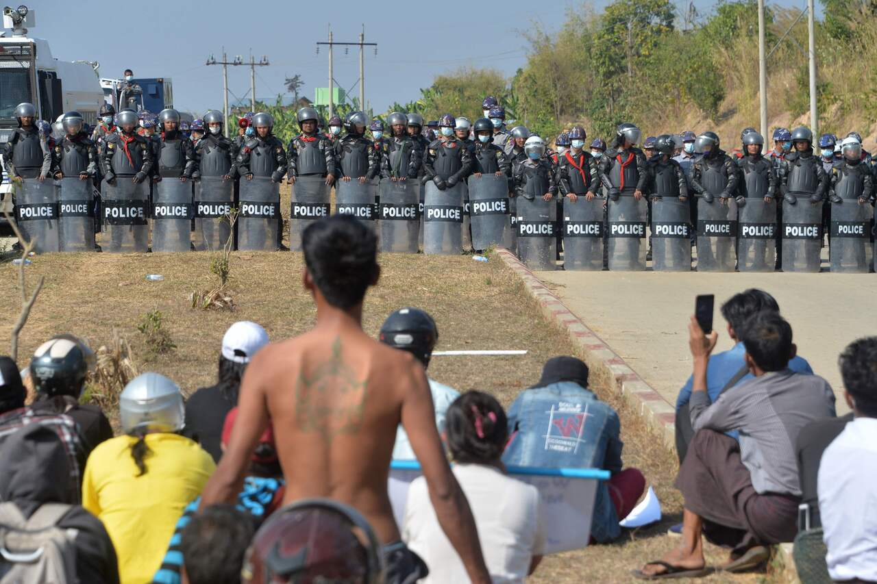 Riot police stand guard near a prison during a demonstration by protesters against the military coup in Naypyitaw, on Feb 15, 2021.