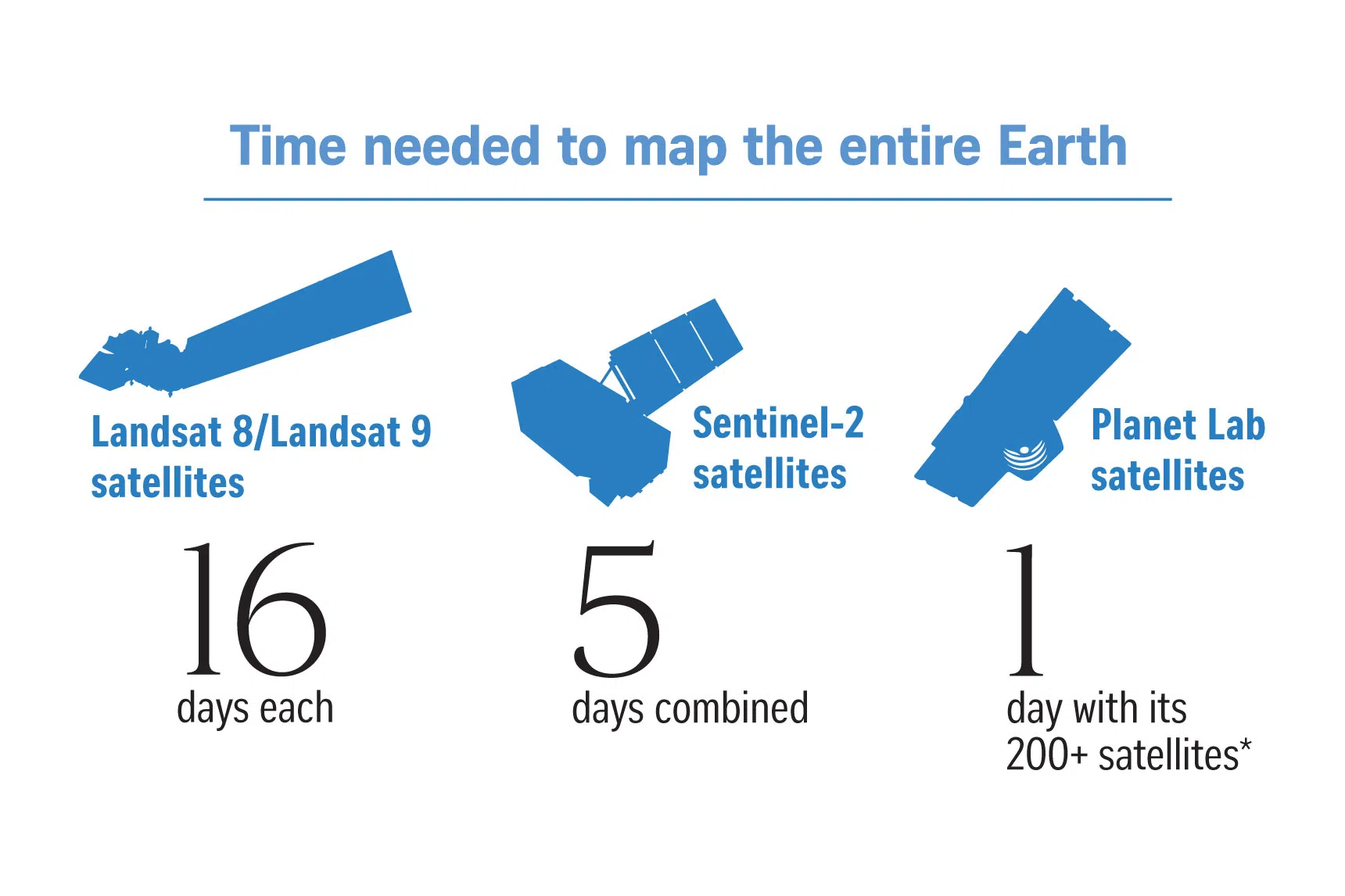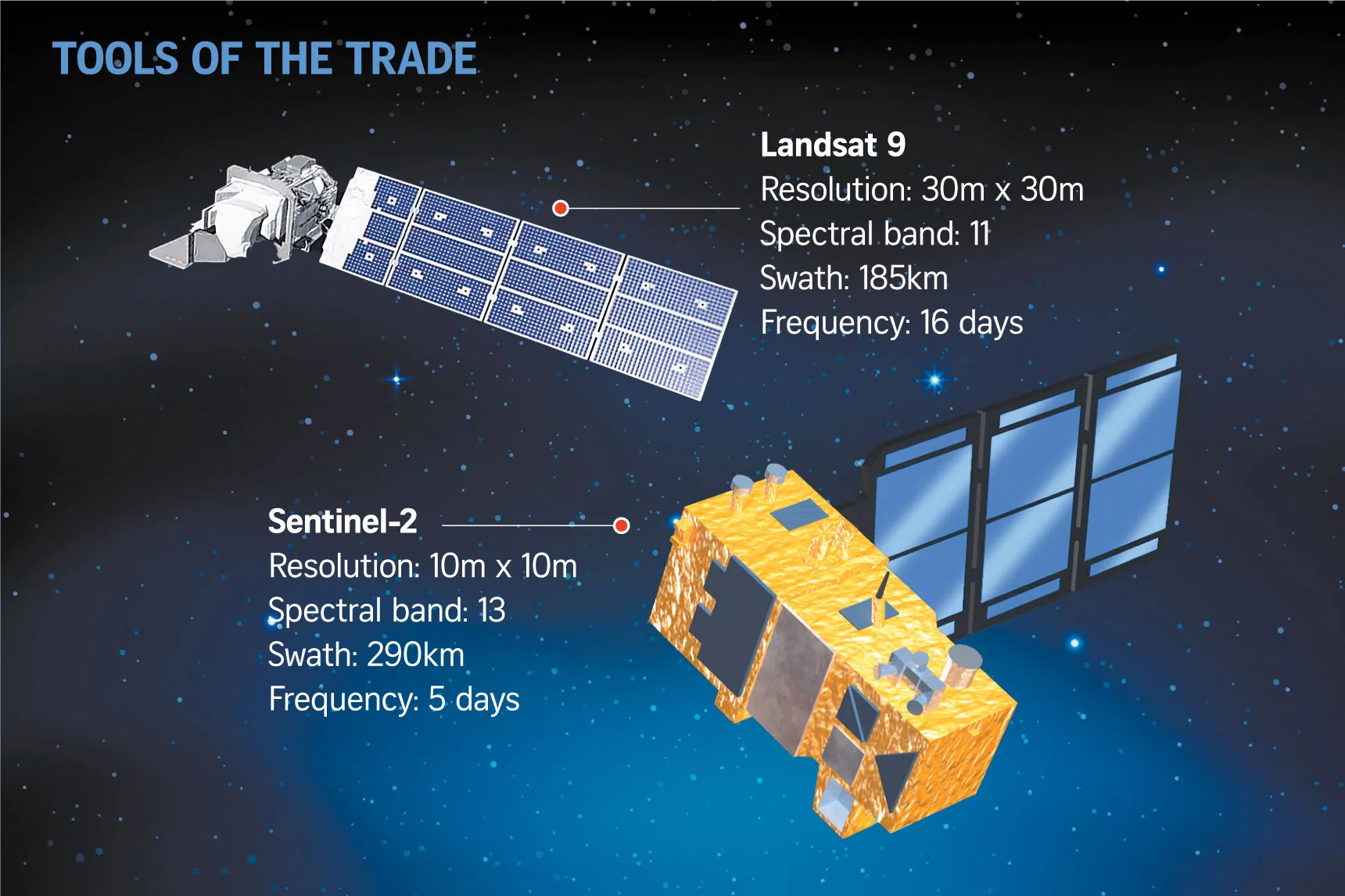 The greater the frequency of images being captured over the same spot, the quicker the detection of tree cover change and the more accurate the calculations of such change. Landsat 8 and Landsat 9 satellites image the entire Earth every 16 days each. For the Sentinel-2 satellites, it is five days combined, while Planet Lab’s 5m by 5m higher-resolution maps are generated monthly. Satellites, as they orbit the globe, take images in bands, called swaths. Sentinel-2’s swath is 290km wide, for example.