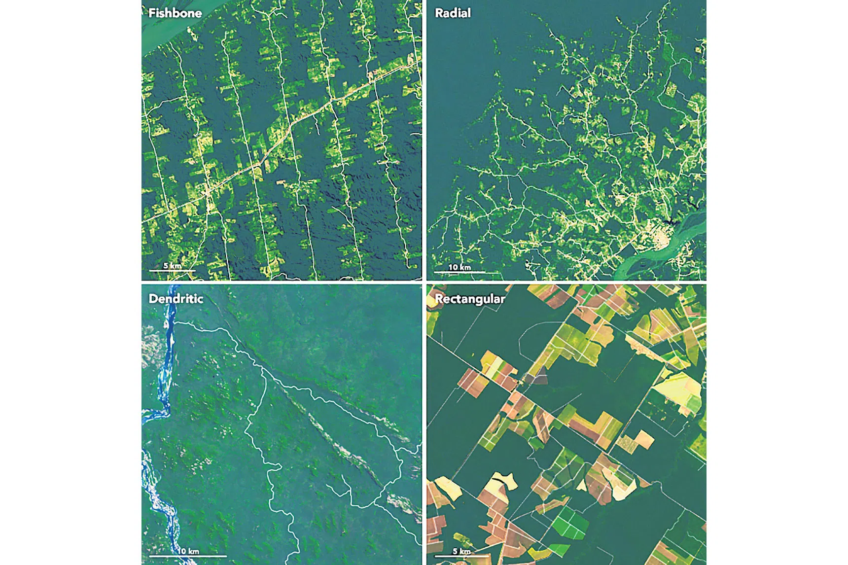 Deforestation patterns can vary. Industrial-scale plantations, such as oil palm and pulpwood create regular patterns, such as rows of rectangular blocks.