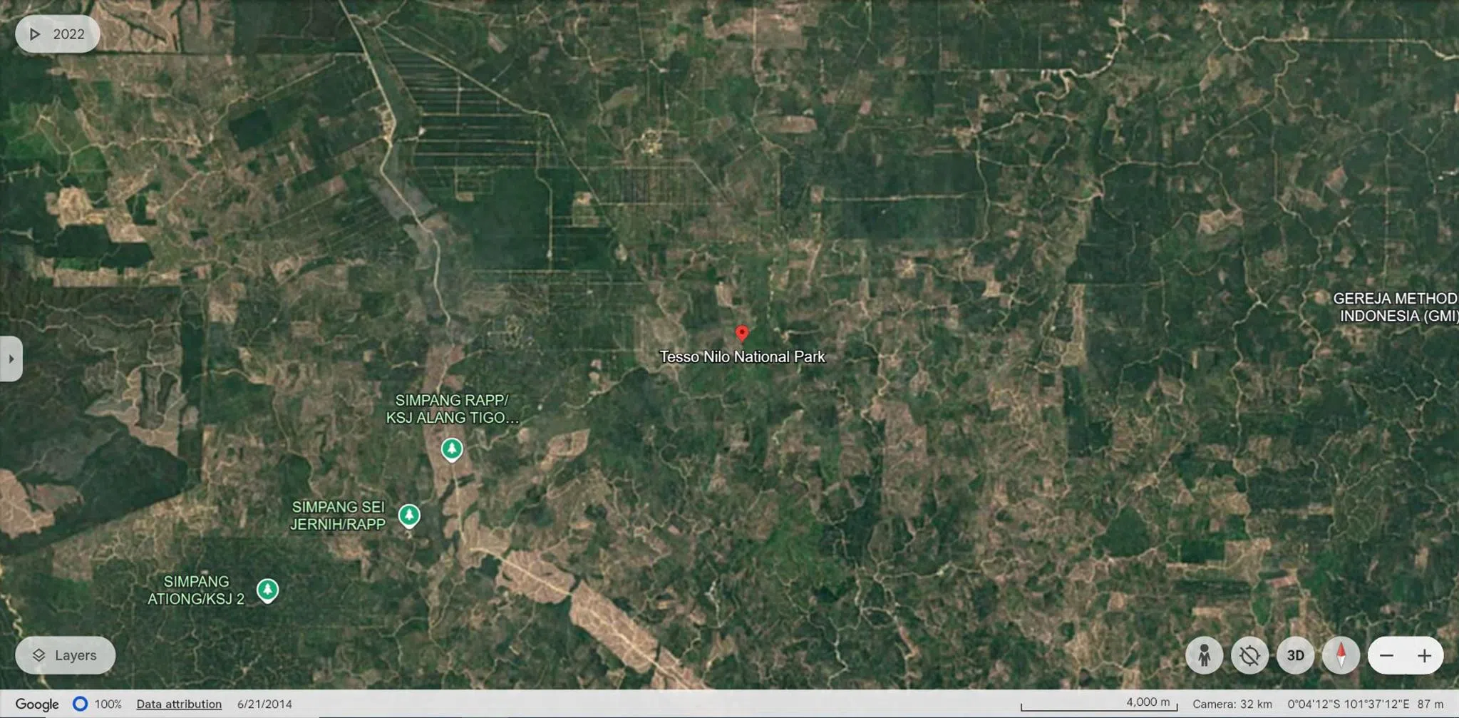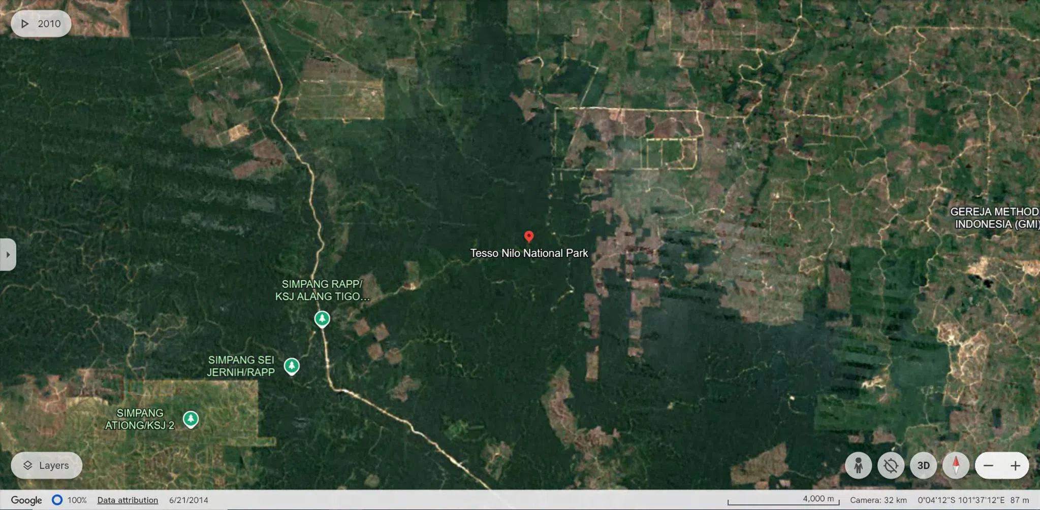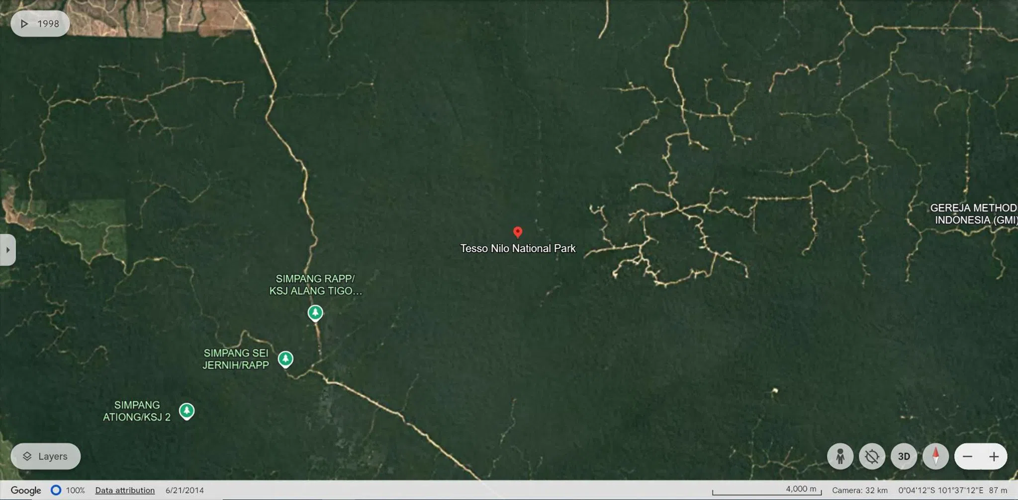 A time series showing the progressive deforestation of Tesso Nilo National Park, in Riau Province, Sumatra. This was seen first in 1998.