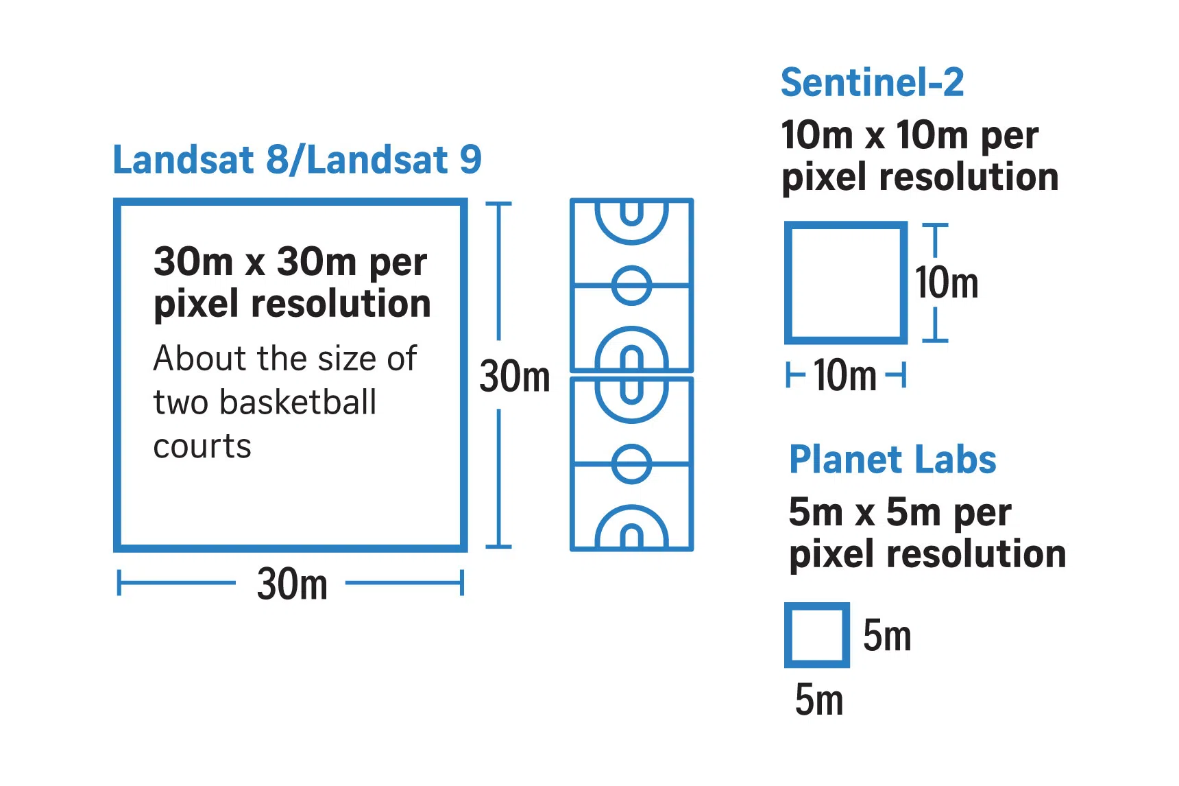 The smaller the pixel, the greater the detail in images captured. The World Resources Institute’s Global Forest Watch monitoring programme uses a 30m by 30m resolution (about the size of two basketball courts) from Landsat 8. This means each pixel in the satellite image is 30m by 30m in size (Think of zooming in on an image on your phone until you can see individual pixels). Sentinel-2 uses 10m by 10m per pixel resolution, while Planet Labs uses 5m by 5m per pixel resolution for tropical regions. Some satellites are now capable of providing images as fine as less than 1m by 1m per pixel.