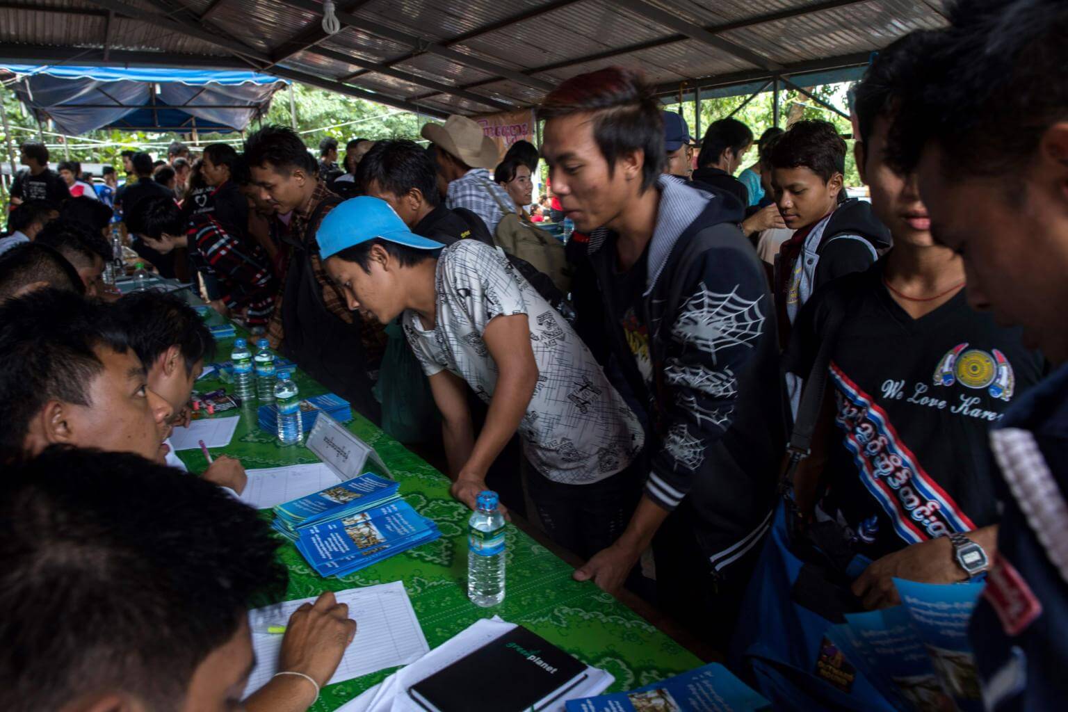 Migrant workers returning from Thailand doing paperwork as they arrive at the Myanmar immigration office in Myawaddy, on July 6, 2017.
