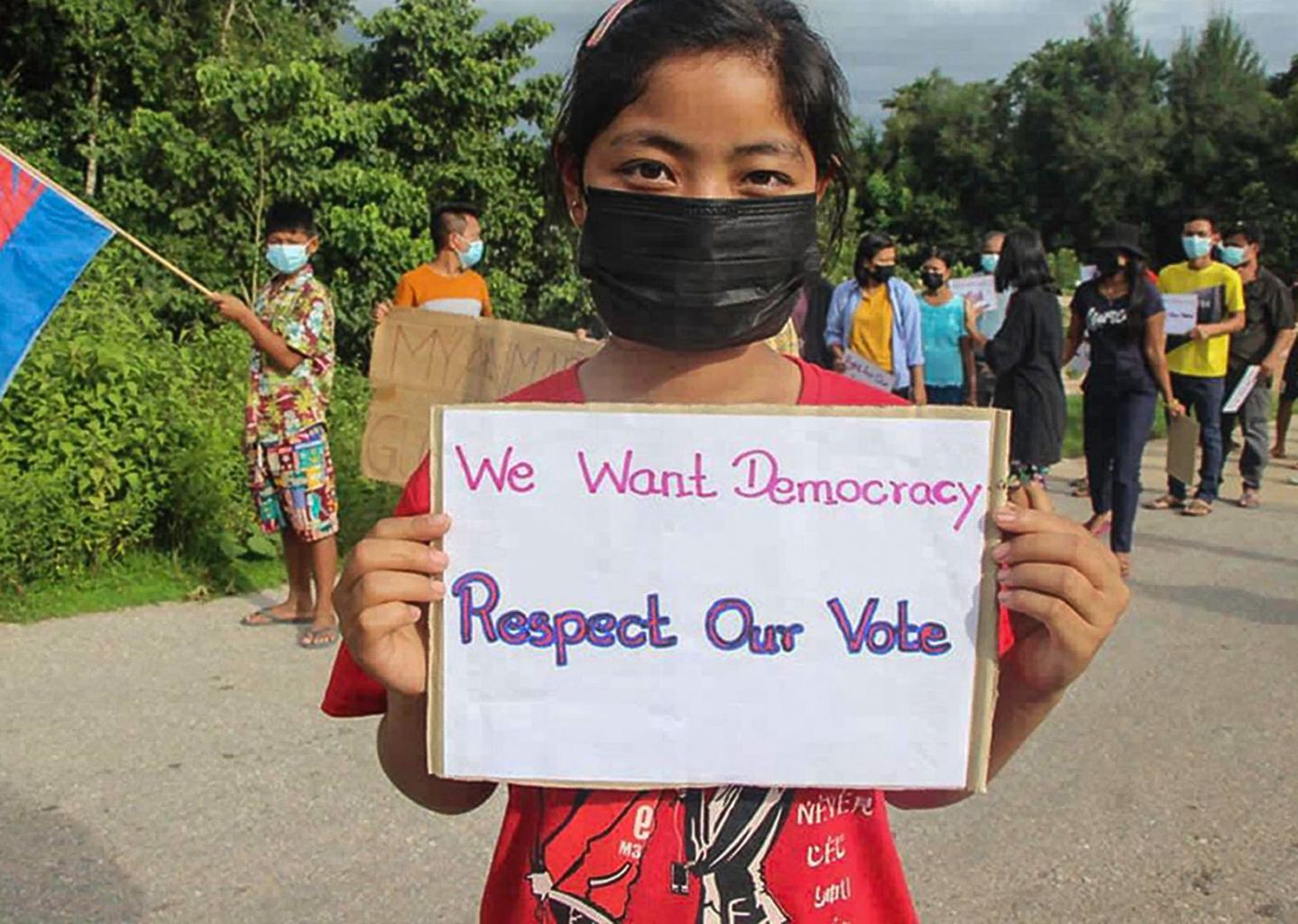 A protester holds a sign during a demonstration against the military coup in Dooplaya district in Myanmar's Karen state.