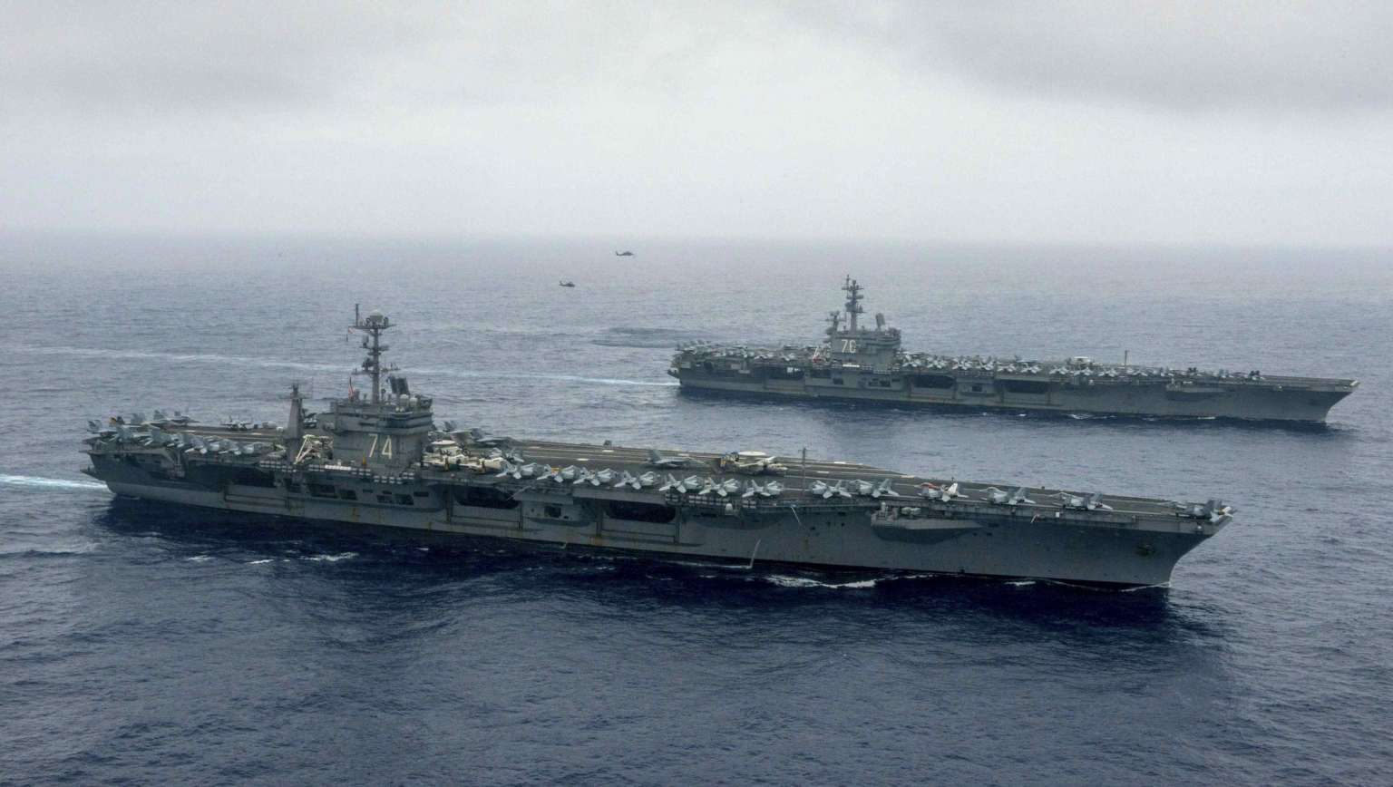 The US Pacific Command said the USS John C. Stennis and USS Ronald Reagan, among the world's largest warships, began conducting air defence drills, sea surveillance, and long range strikes on Saturday.