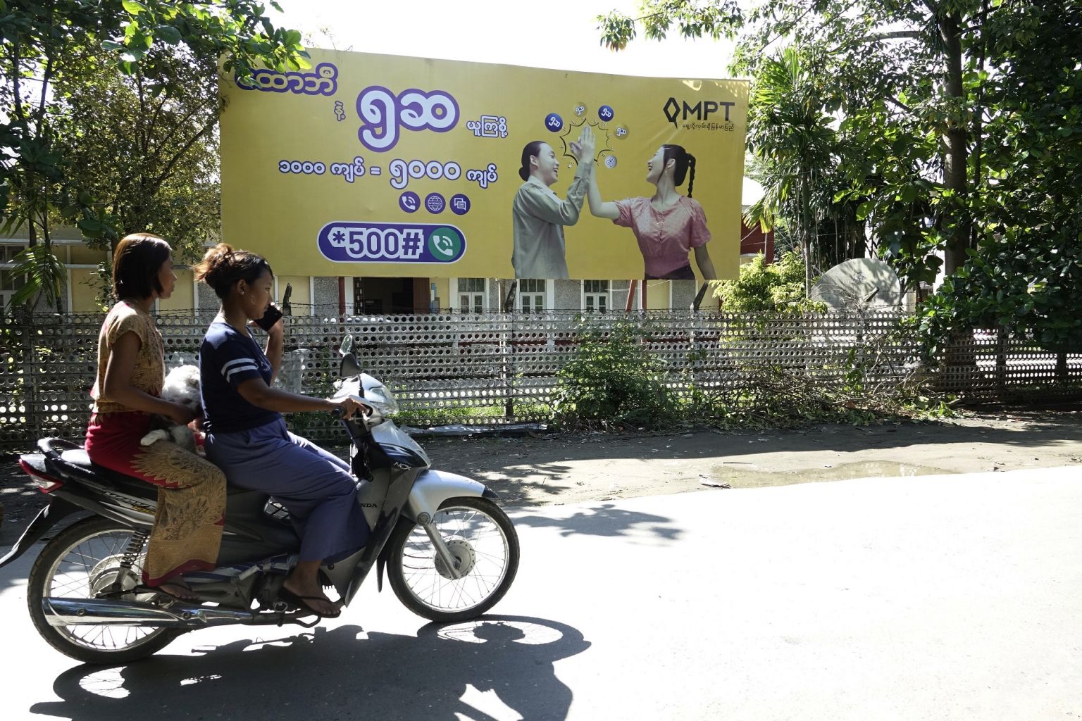 Two Rakhine women ride a motorcycle past a telecommunications advertisement poster in Sittwe.