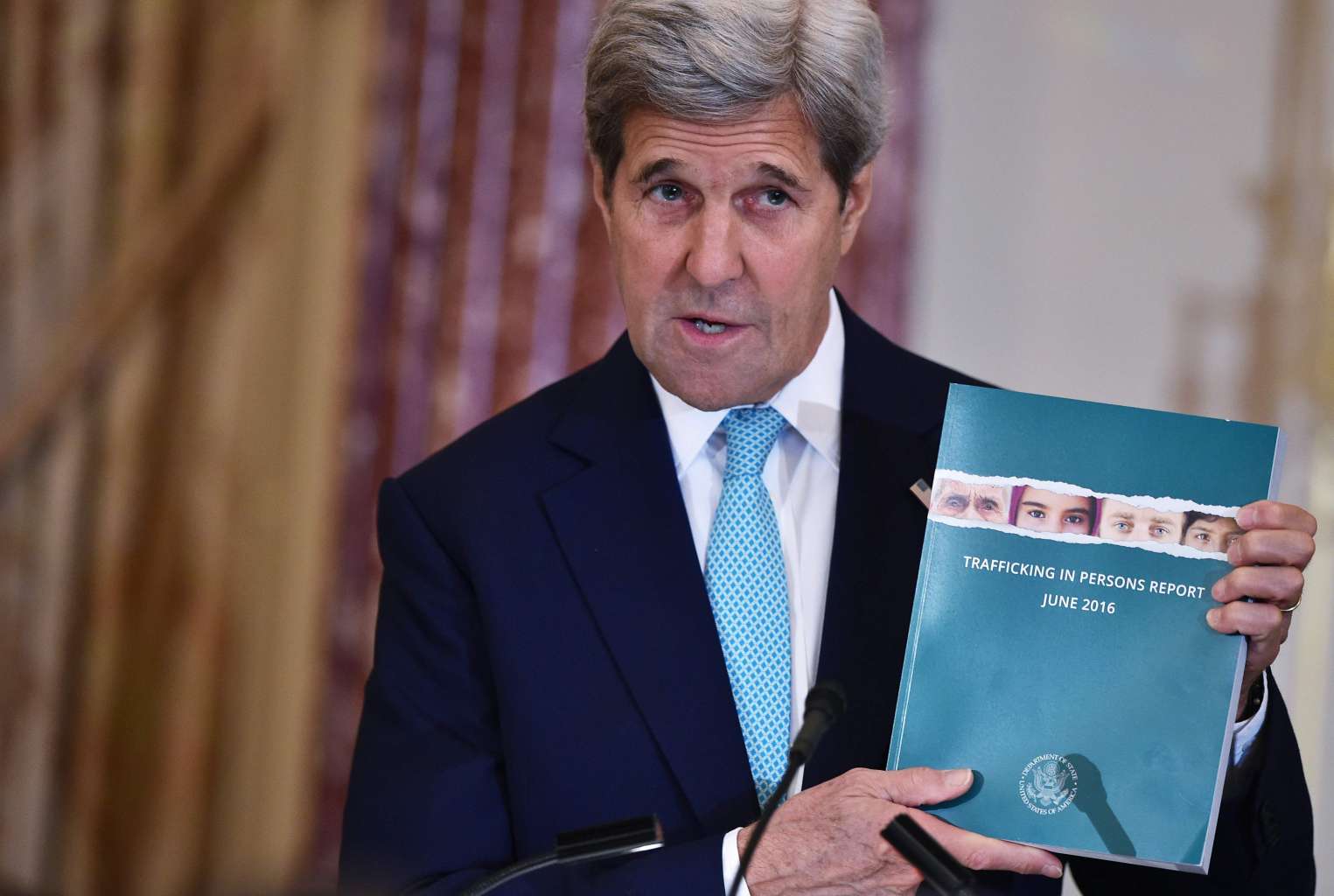 US Secretary of State John Kerry holds a copy of the 2016 Trafficking In Persons Report during its release on June 30, 2016.
