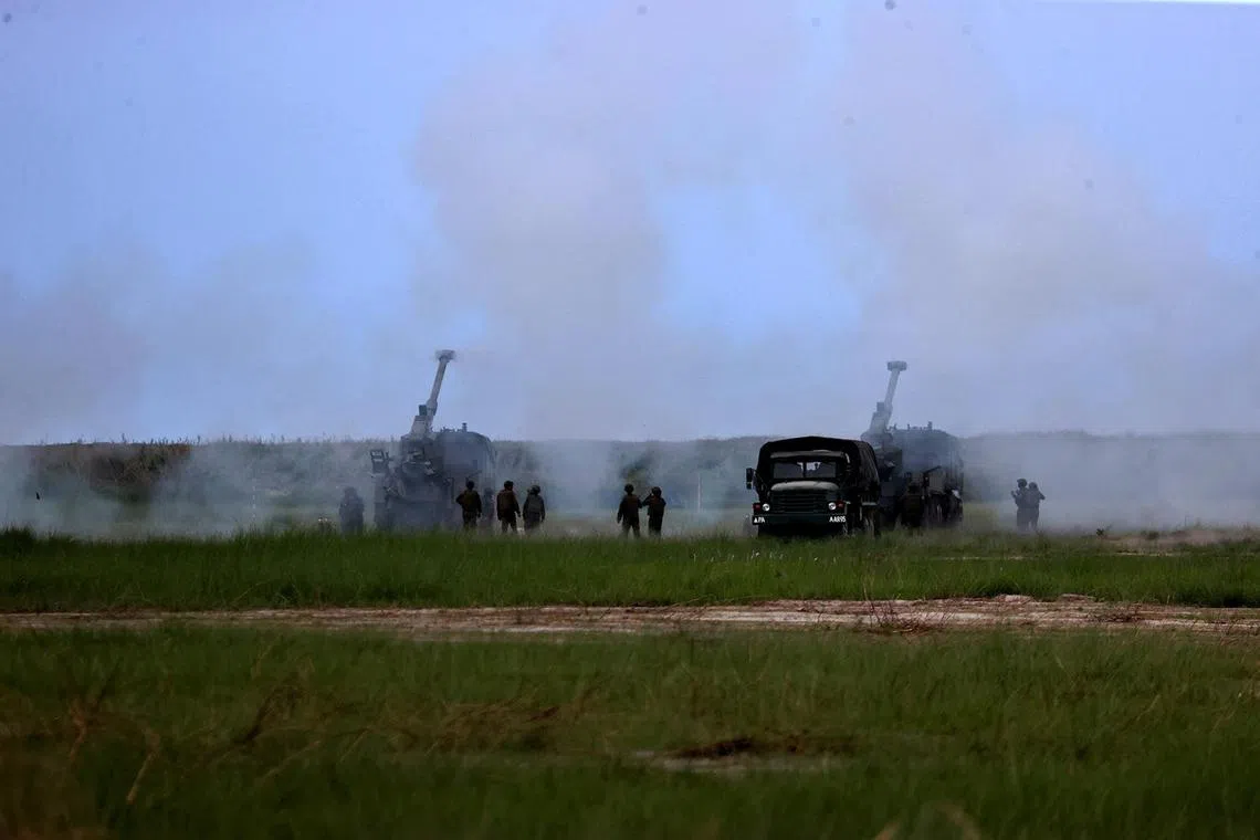 Filipino and US troops use artillery units to fire at floating targets offshore during the Balikatan war games in Zambales, Philippines on April 26, 2023.