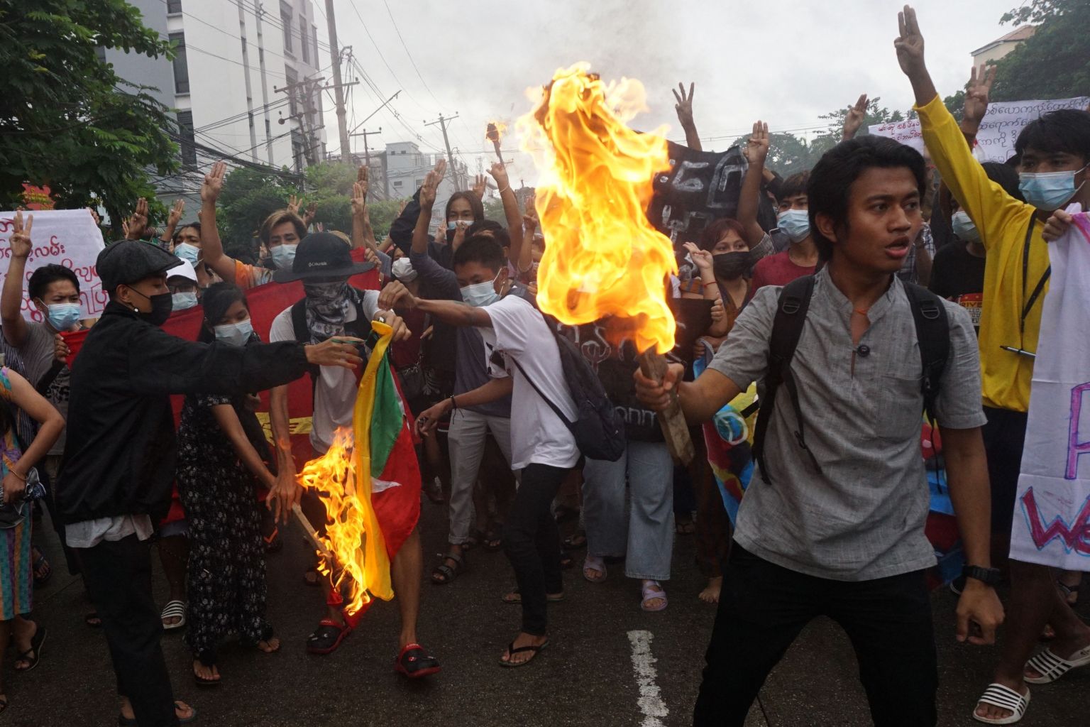 Protesters burn a Myanmar flag and a military uniform as they take part in a flash mob demonstration against the military coup in Yangon on July 1, 2021.