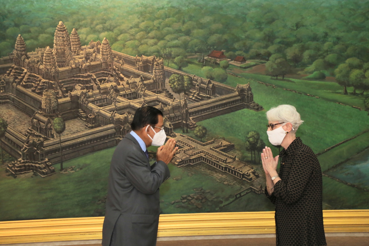 Cambodian Prime Minister Hun Sen (left) greets US Deputy Secretary of State Wendy R. Sherman in Phnom Penh, on June 1, 2021.