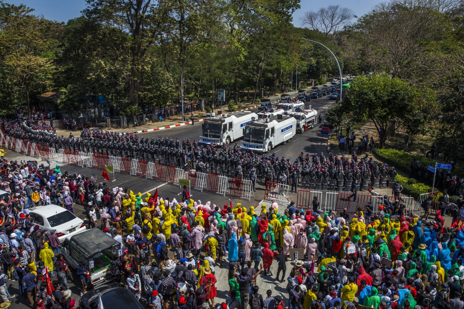 Protesters and security forces facing off in Yangon on Feb 9, 2021.