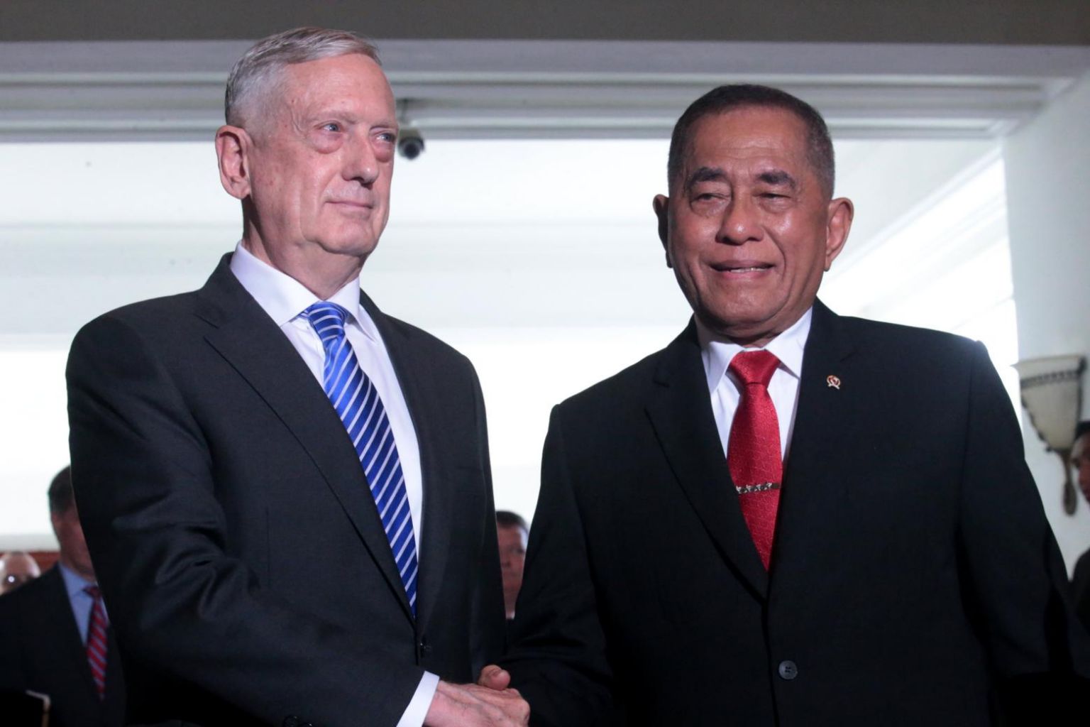 US Secretary of Defence Jim Mattis (left) shakes hands with Indonesian Minister of Defence Ryamizard Ryacudu during their meeting in Jakarta, Indonesia, on Jan 23, 2018.