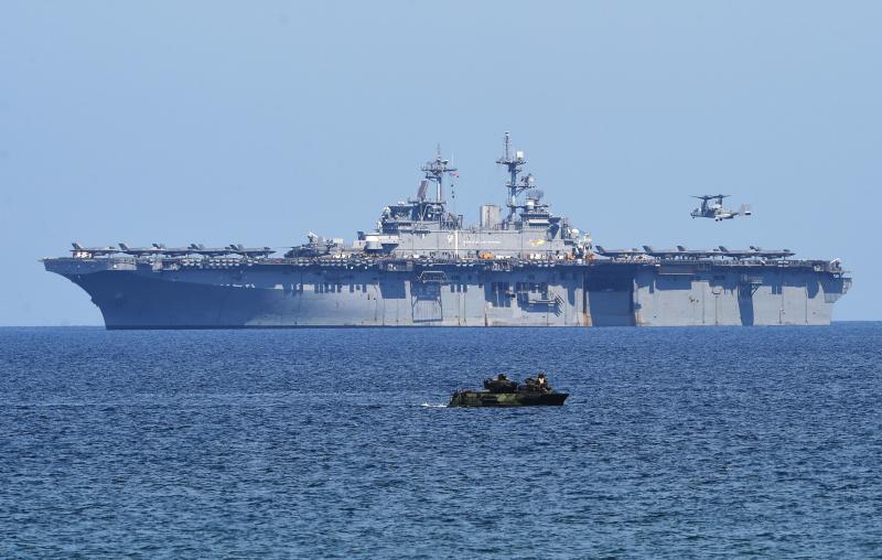 The amphibious assault ship USS Wasp, with at least 10 F-35B stealth jets on deck, stood guard as amphibious tanks rolled onto a Philippine beach located a short sail from islands also claimed by China.