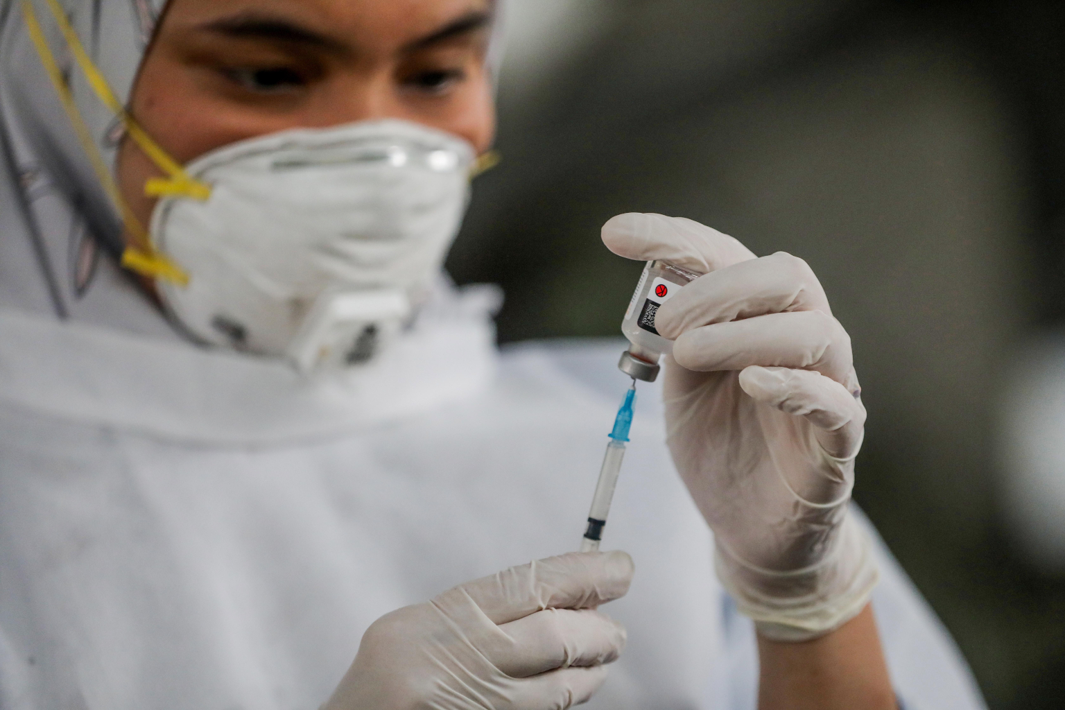 A healthcare worker prepares a Covid-19 vaccine dose during a mass vaccination drive for university lecturers in Medan, Indonesia, on March 29, 2021.