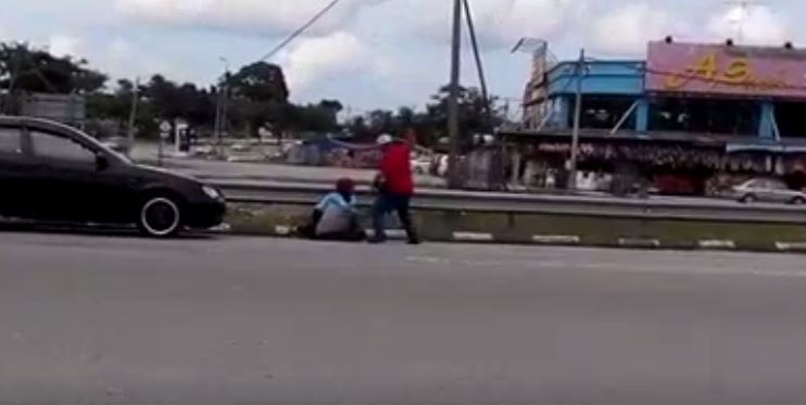 In the video, the woman is seen sitting by the side of the road, near the Tol Plaza Ayer Hitam, in front of a black car. The man, dressed in a red shirt, can be seen raining multiple blows on her.