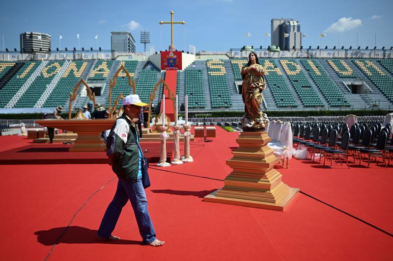 An official walks on the main stage where Pope Francis is scheduled to conduct holy mass at the National Stadium in Bangkok on Nov 20, 2019.