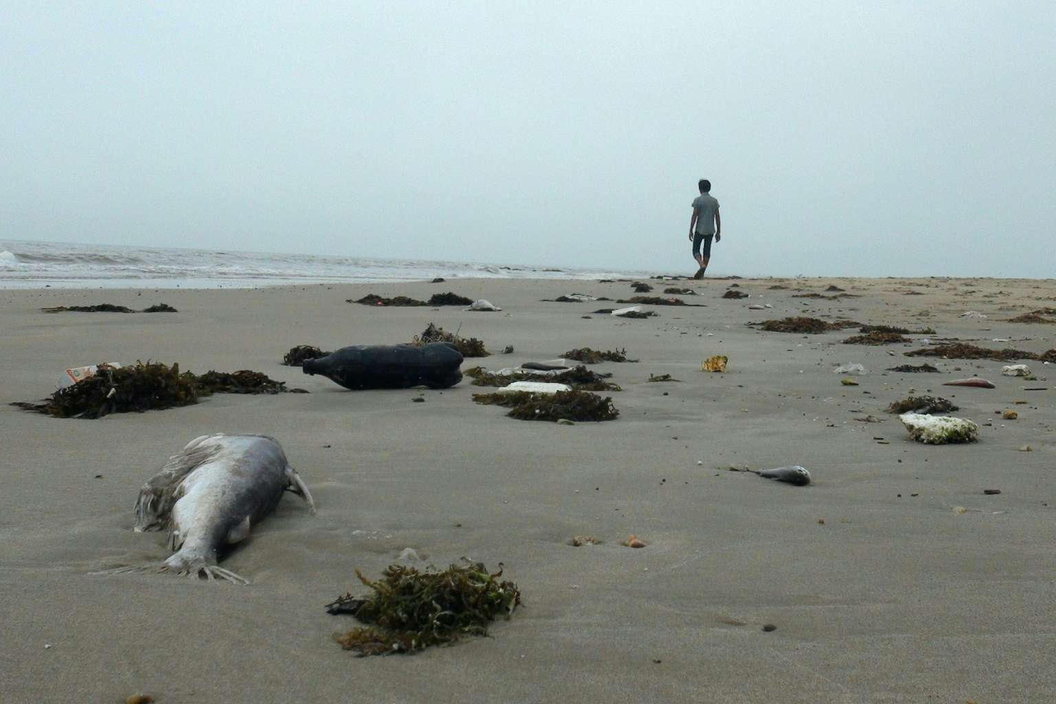 A man walks among dead fish lying on a beach in Quang Trach district in the central coastal province of Quang Binh on April 20, 2016.