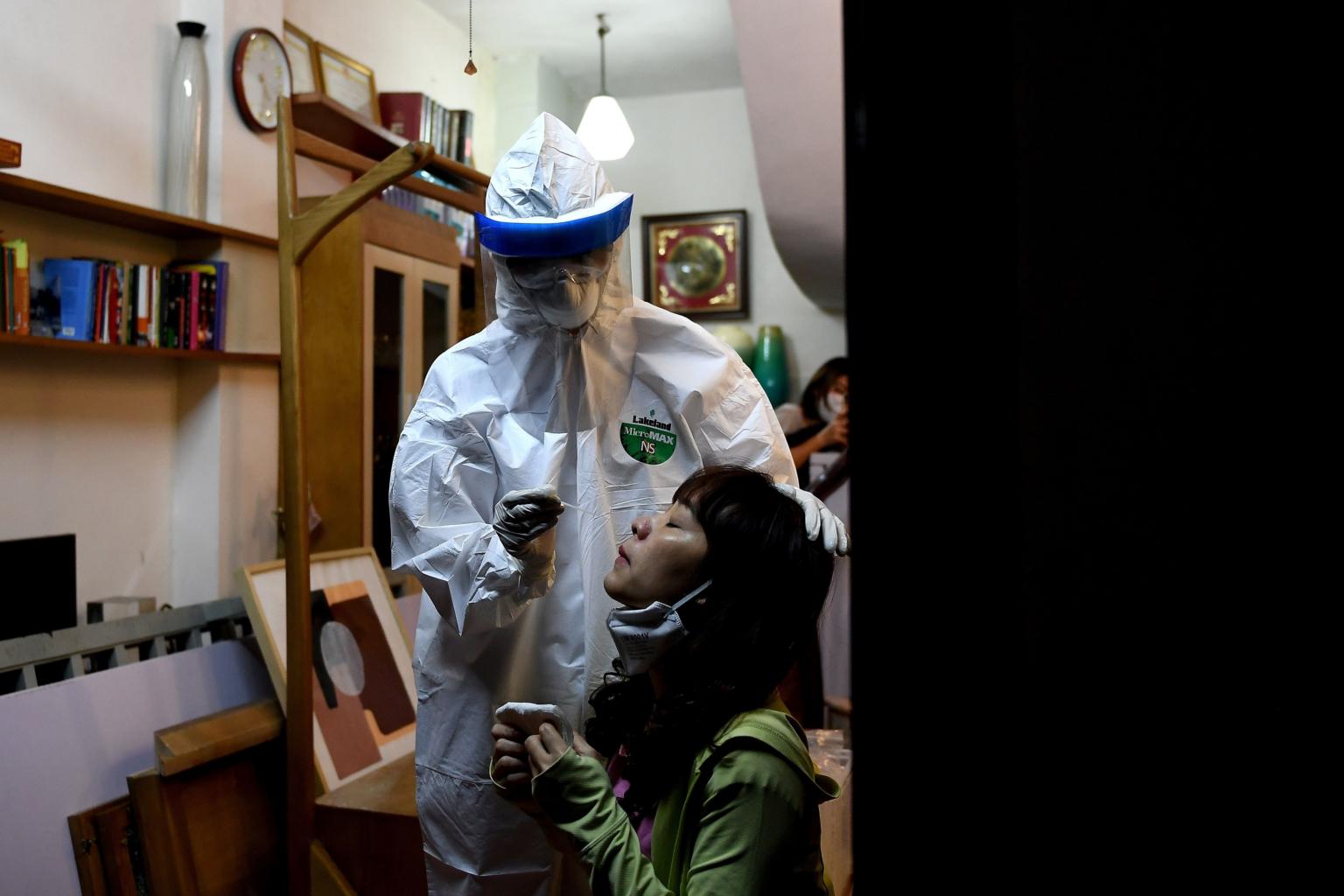 A healthcare worker conducts a swab test on a woman in her house in Hanoi on March 30, 2020.