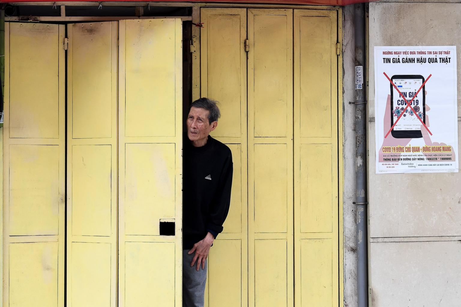 An man looks out of his house next to a poster urging the public not to spread fake news about the coronavirus, in Hanoi, on April 9, 2020.