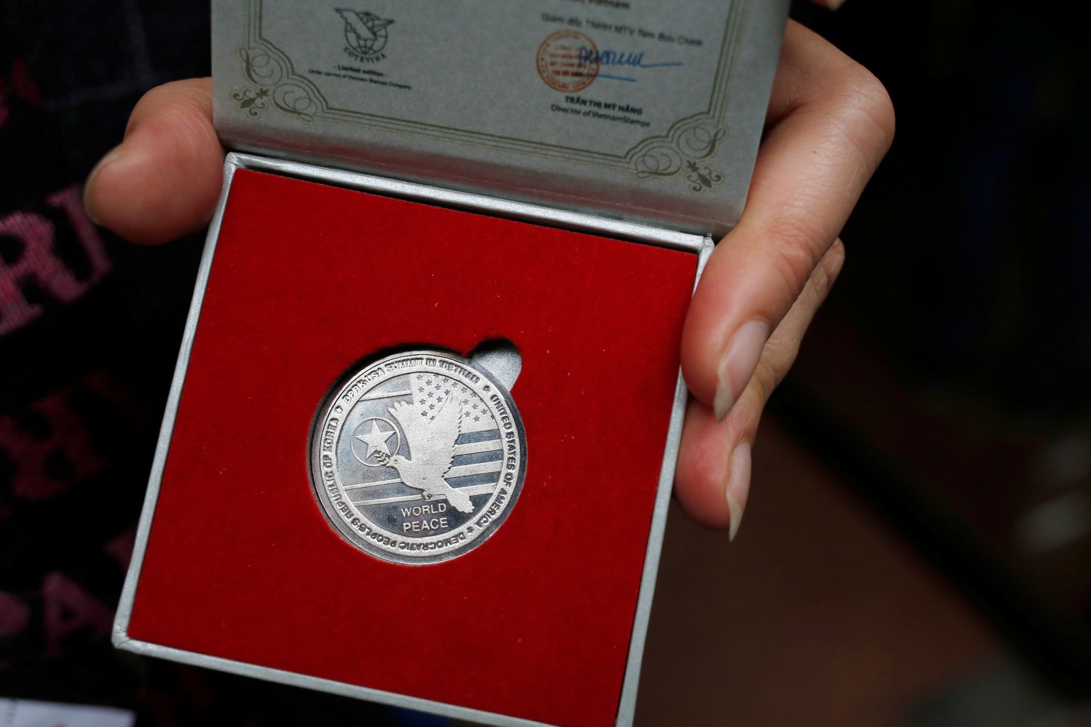 One of 300 limited edition commemorative silver coins minted by the Vietnam Stamps Company to mark the second North Korea-US summit in Hanoi, Vietnam on Feb 27, 2019.