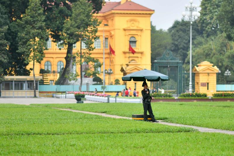 A Vietnamese policeman standing guard outside the presidential palace in Hanoi on Feb 9, 2019.