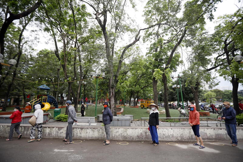 People stand in line for free rice, at a distance of 2m from each other in Hanoi, on April 12, 2020.