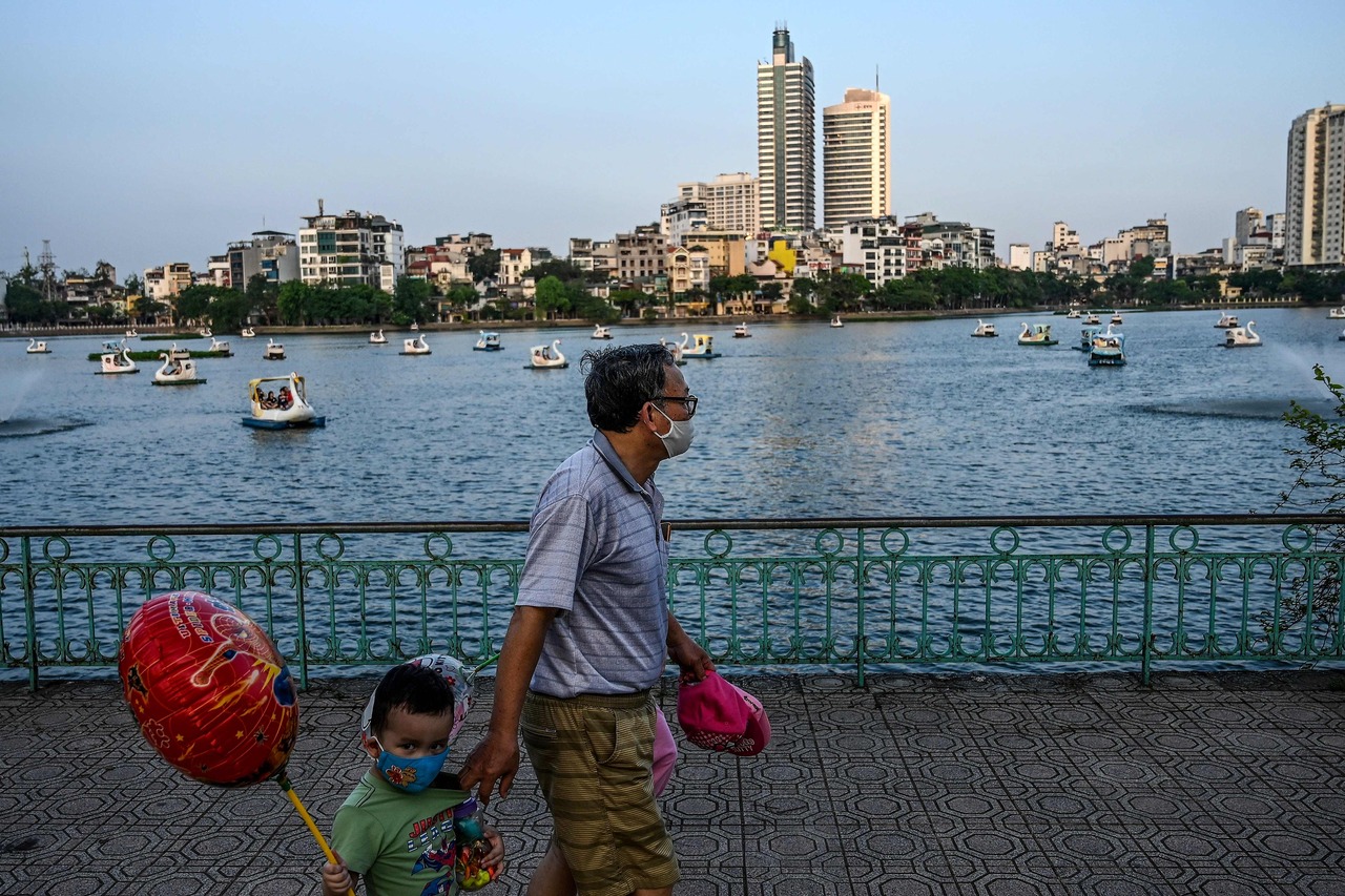 A man and a child walk by a lake in Hanoi on May 2, 2020.