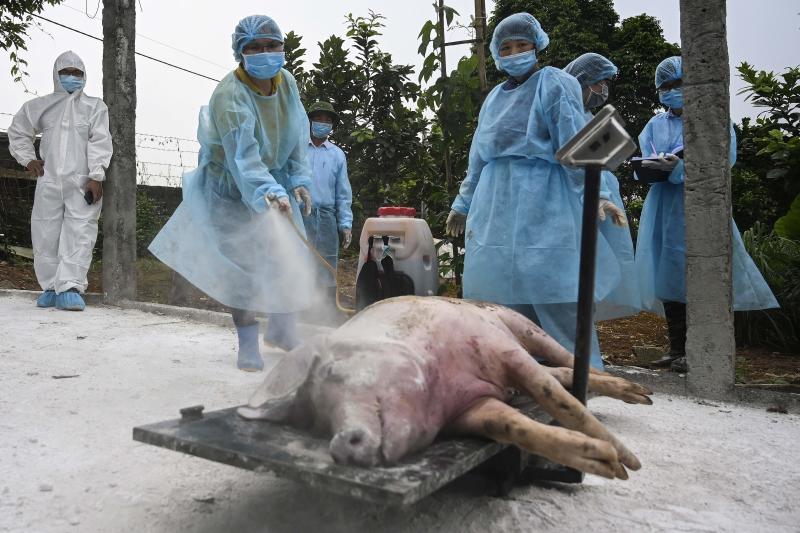 Health officials spraying disinfectant on a dead pig at a farm in Hanoi before burying it in an isolated quarantined pit to stop the spread of African swine fever.