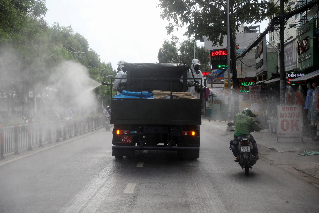 A truck sprays disinfectant amid the Covid-19 outbreak in Ho Chi Minh city, on June 1, 2021.