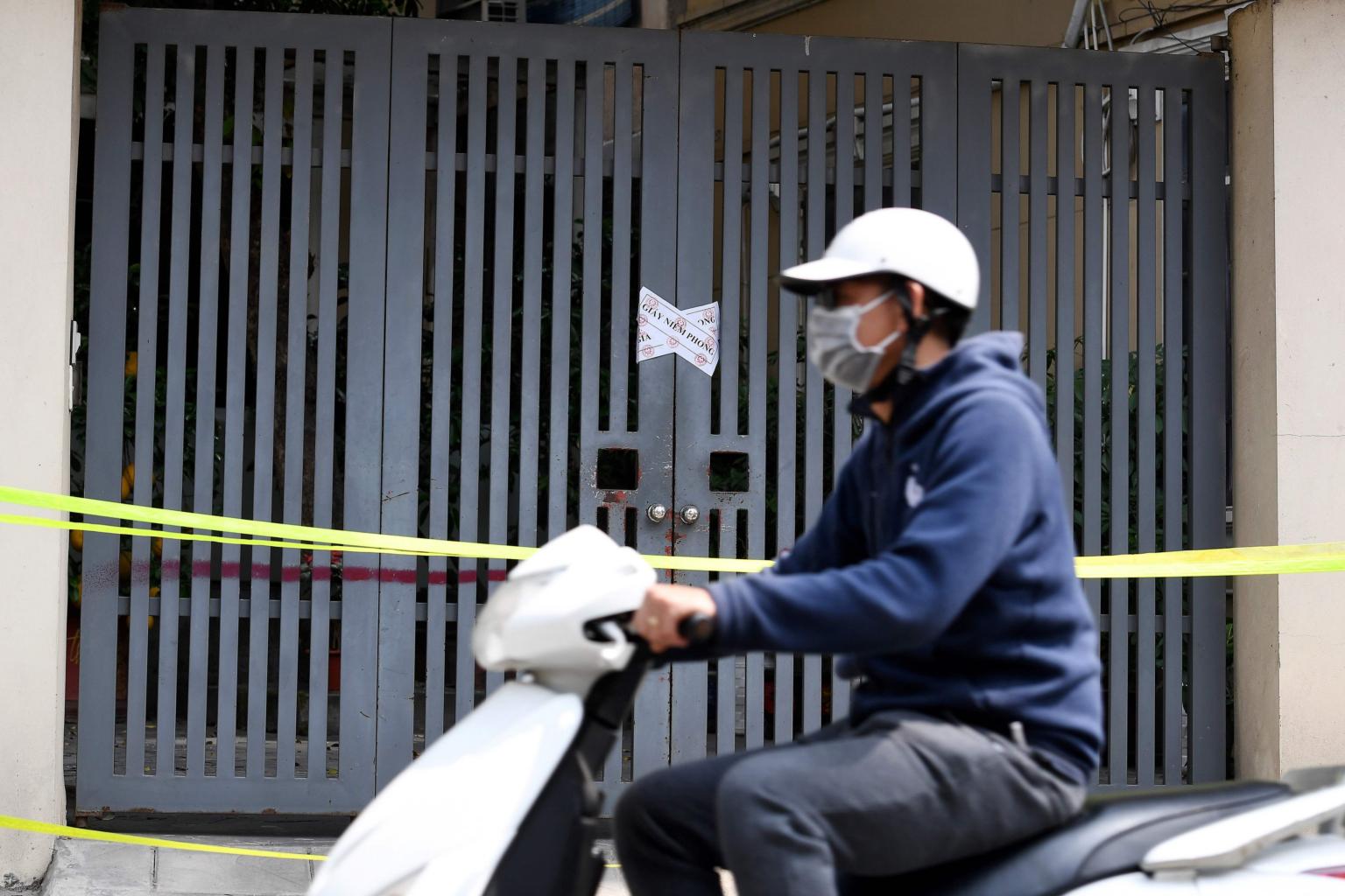 A motorist wearing a face mask rides past a quarantined house of a Vietnamese passenger who arrived from London, in Hanoi on March 9, 2020.