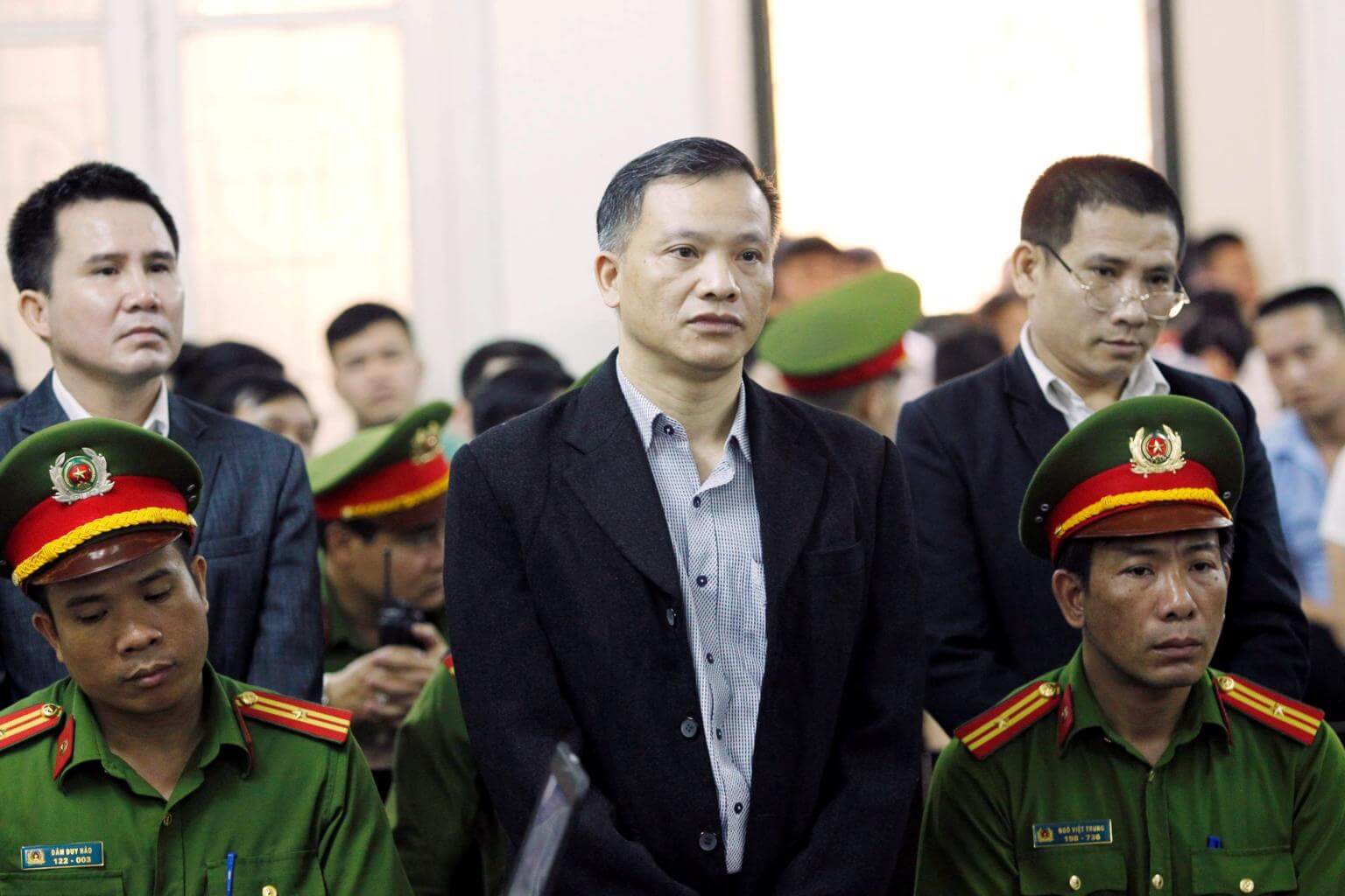 Vietnamese dissident Nguyen Van Dai (centre), founder of the anti-government Brotherhood for Democracy group, stands at a court in Hanoi on April 5, 2018.