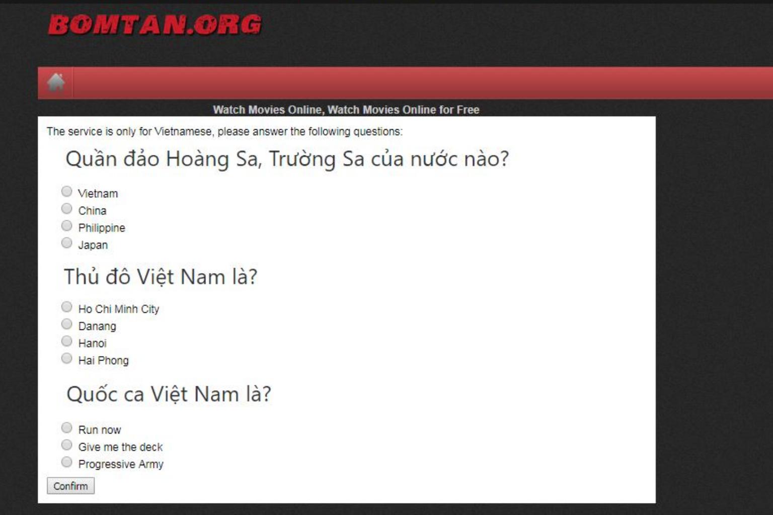 The website, which did not appear to have rights to broadcast the drama, asks users to answer questions confirming their Vietnamese identity before the website loads.