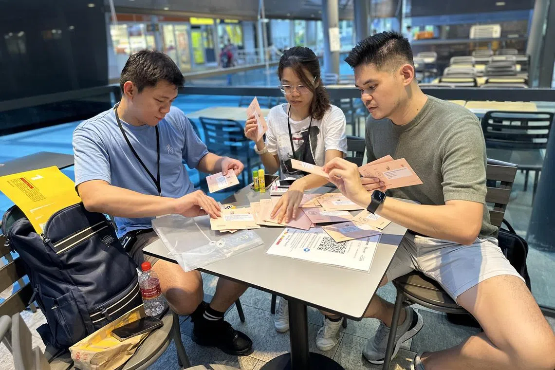 (From left) Volunteers Shane Chew, Kaishan and Calvin Ong sorting the ballots they received at the collection point in Paya Lebar Square on Aug 5.