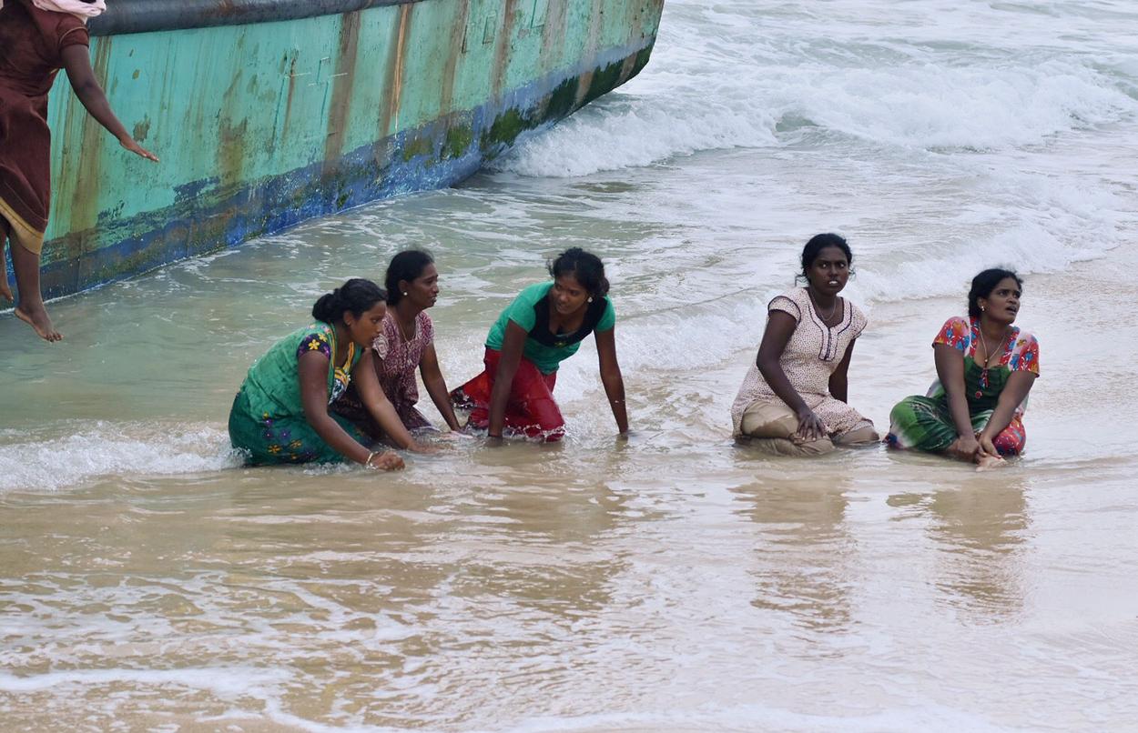 Migrant women from Sri Lanka jumping out from their stranded boat onto the beach in Lhoknga, Aceh province, on June 16, 2016.