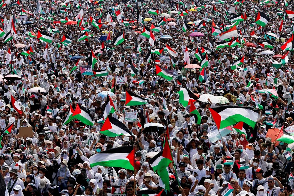 People waving Palestinian and Indonesian flags during a rally supporting at the National Monument complex in Jakarta on Nov 5.