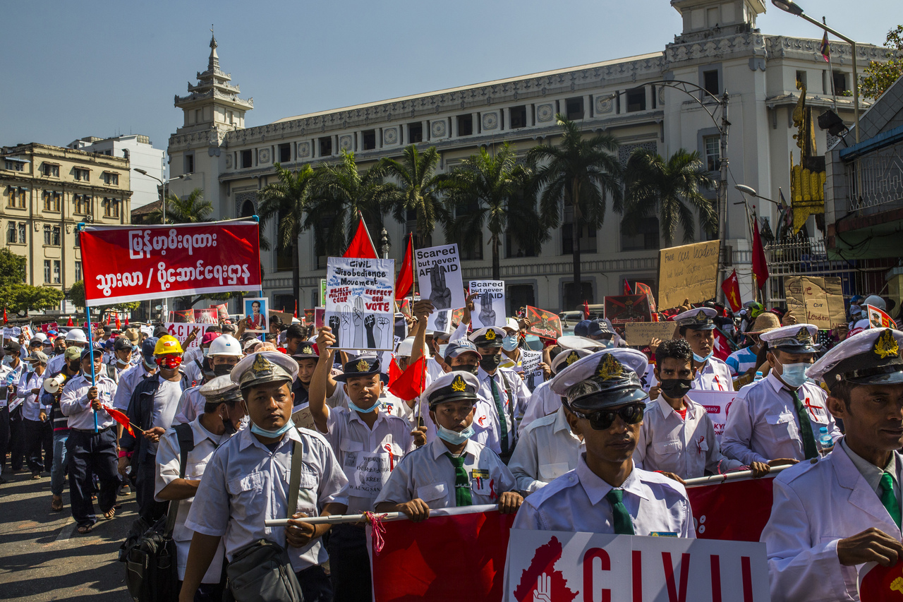 In Mandalay on Monday afternoon, hundreds of protesters gathered outside offices of the state-run Myanmar Economic Bank and urged employees to join the walkout. Soldiers and police officers broke up the protest, chasing some demonstrators into nearby houses and beating them.