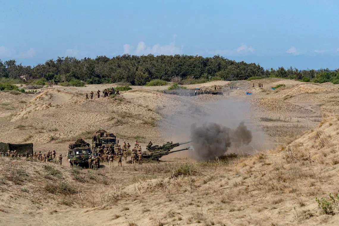Filipino and American troops using 105mm and 155mm howitzers to repel a mock invasion during the counter-landing live fire drills at La Paz Sand Dunes in northern Philippines on May 6.