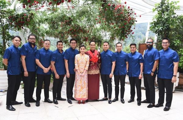 In the photos, Faliq looked dashing in a luxurious maroon red samfu (traditional Chinese men's wear) while the groomsmen donned matching outfits in royal blue.