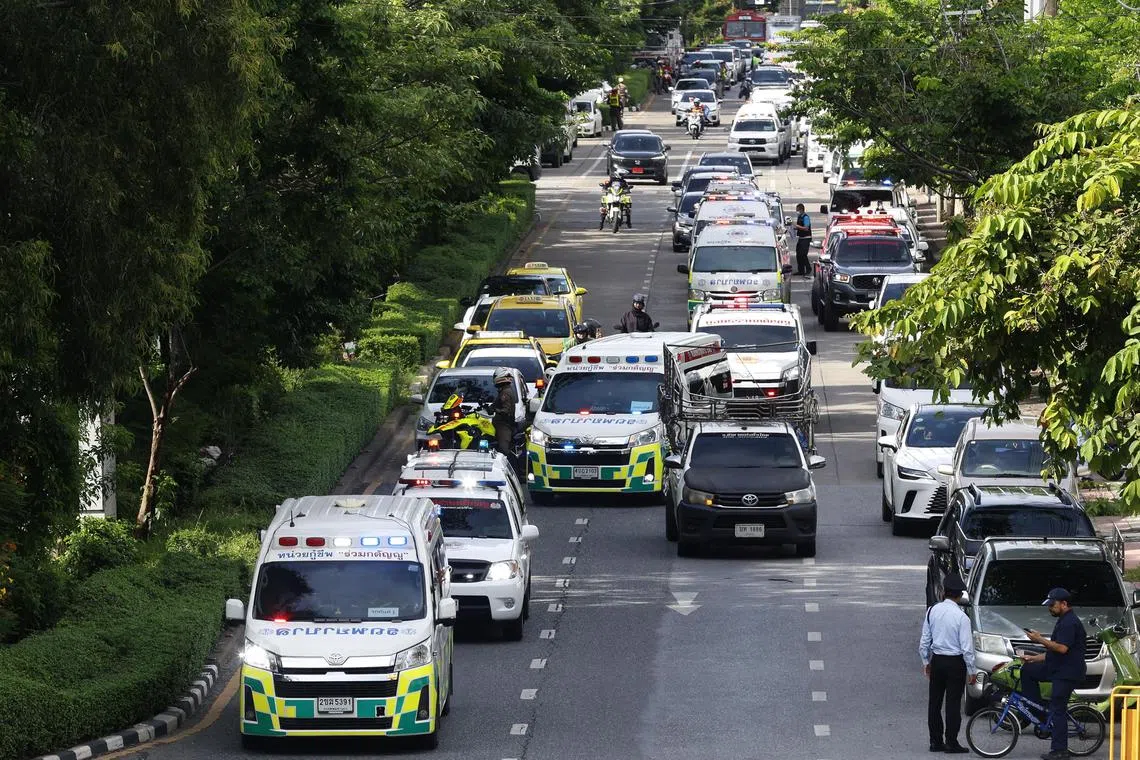 A convoy carrying the bodies of children killed in a bus fire leaves the Institute of Forensic Medicine in Bangkok, Thailand, on Oct 2.