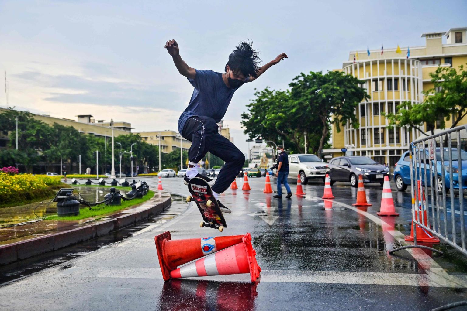 A skateboarder during an anti-government protest in Bangkok on Sept 7, 2021.