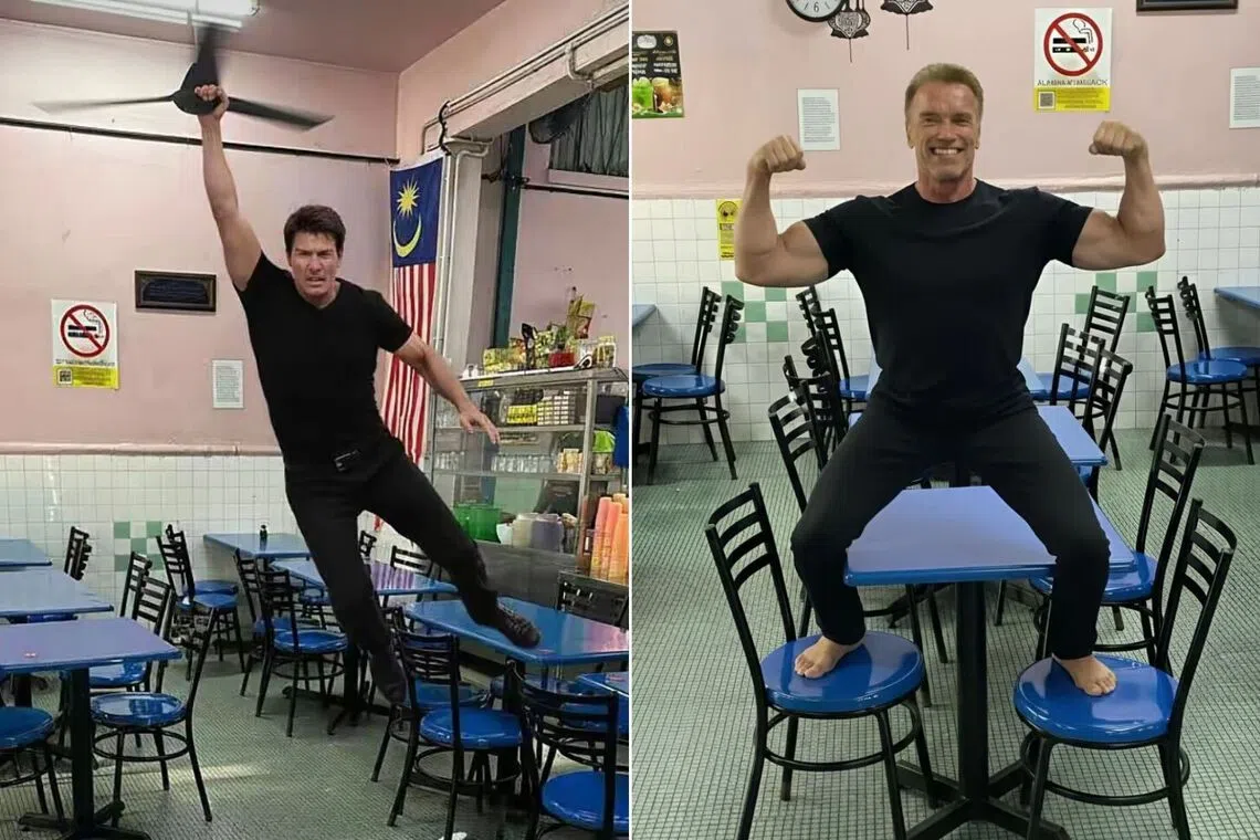 AI-generated images of Tom Cruise (left) and Arnold Schwarzenegger at Nasi Kandar Sulaiman.