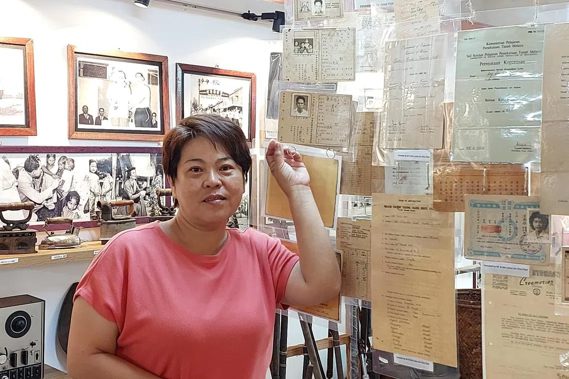 Ms Yuri Tan with her late grandfather’s identification documents and permits to work outside the enclosed Sungai Way settlement.